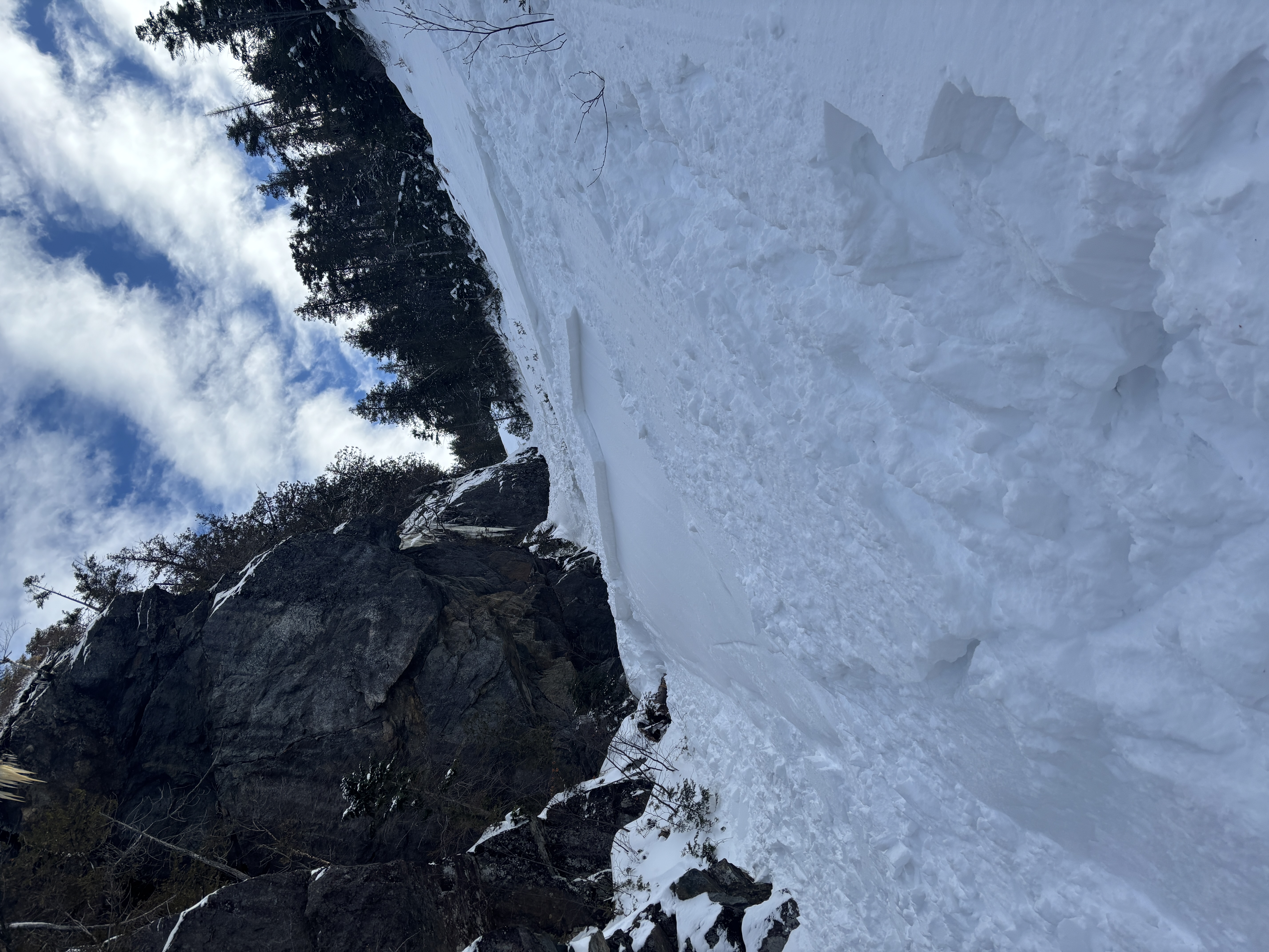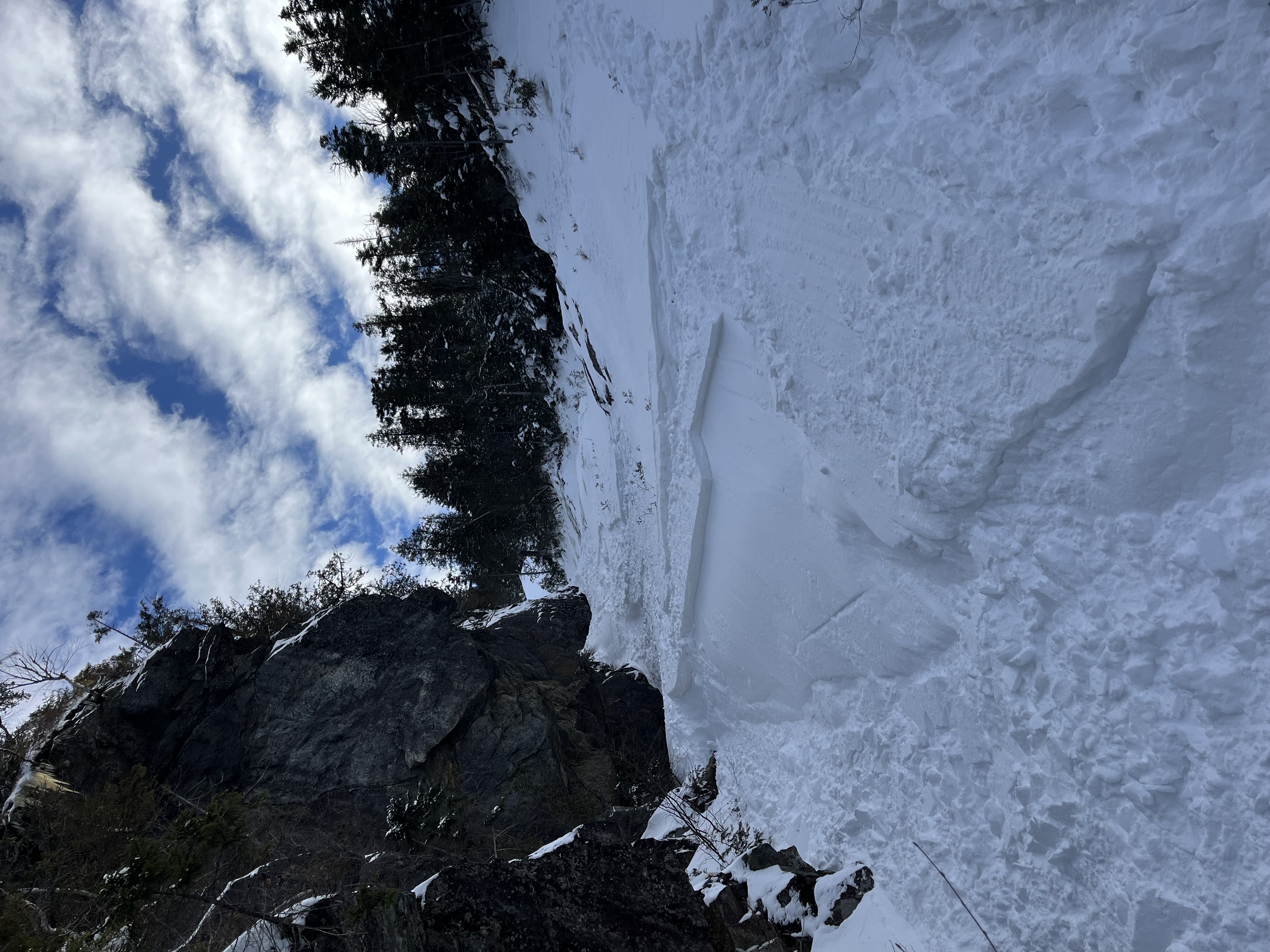This sluff indicates wind loading, which should be mitigated across the high peaks. Snowpack is still very thin, around ~85 cm in highly wind-affected areas.