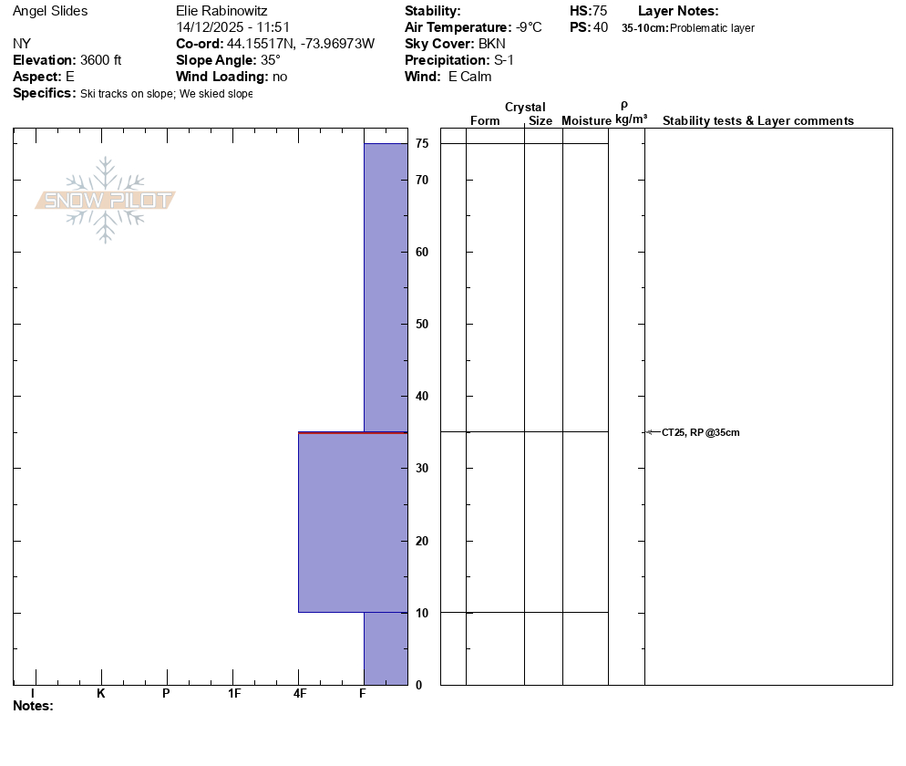 Skied the lookers left slide of Angel, probably 10 sets of tracks in there now. 75 cm snow very light and low density, no base. Tons of great powder turns and yet you can definitely bottom out on rock and ice. The woods leading to the slide skied well too.