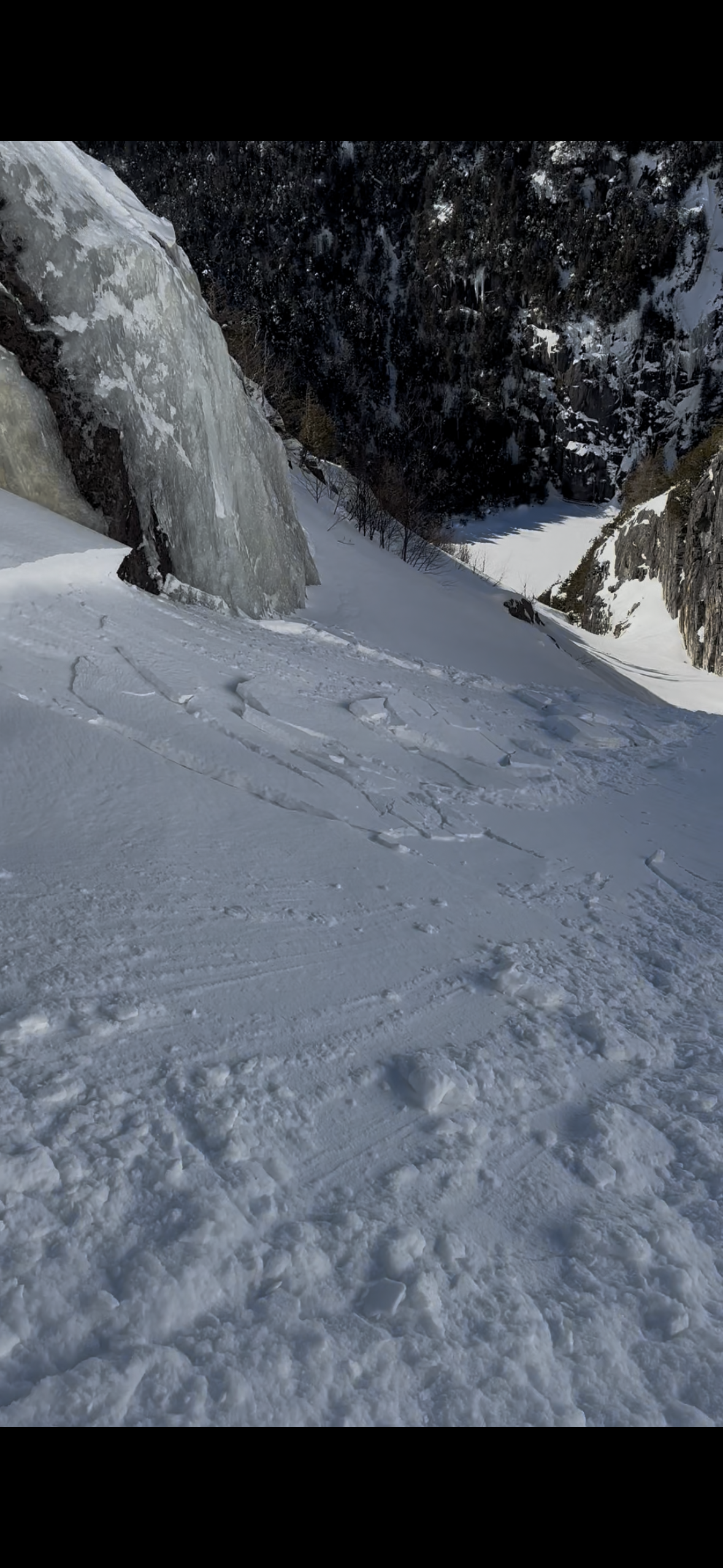 Small wind slab off the skiers left wall in the trap dike, little bit above the upper choke point in a mellower angle section Triggered from above at a distance, only slid off the wall to the middle of the gully ~ 10-15 yards. Slab ranged from a few inches to 10-12in thick