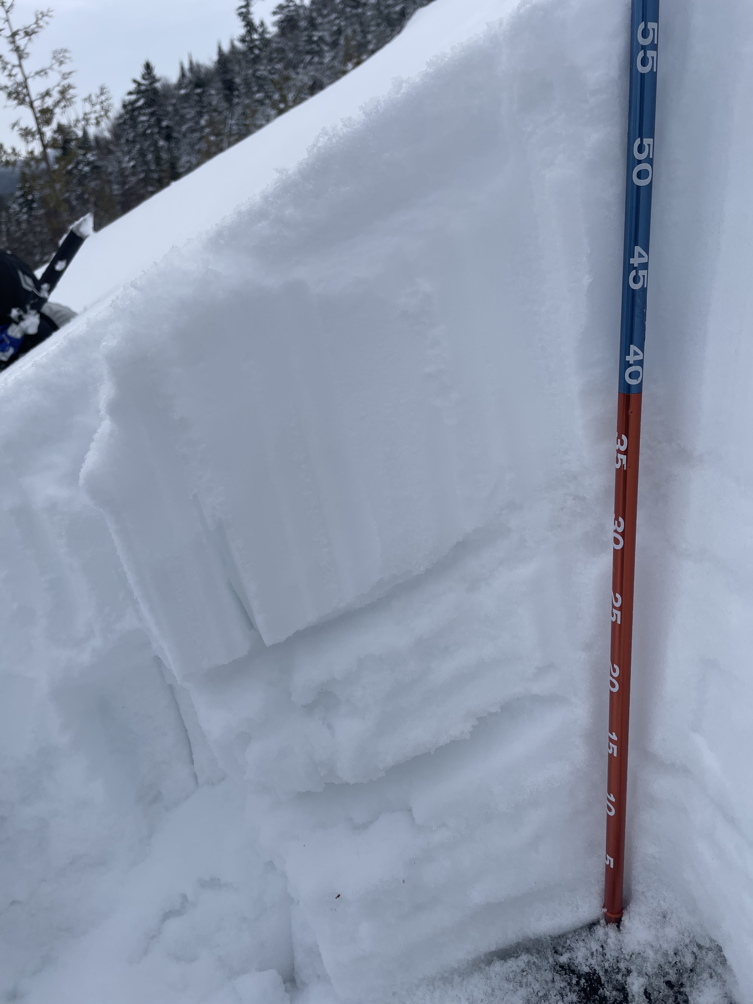 A hasty pit revealed total hight of snow 65cm. 27cm of "newish" snow from our series of small storms since our last major warm up. This fist hard slab is resting on a ~15cm crust amalgamation from our end of December warm ups and rain event. A few distinct crusts can be identified in the jumble.
