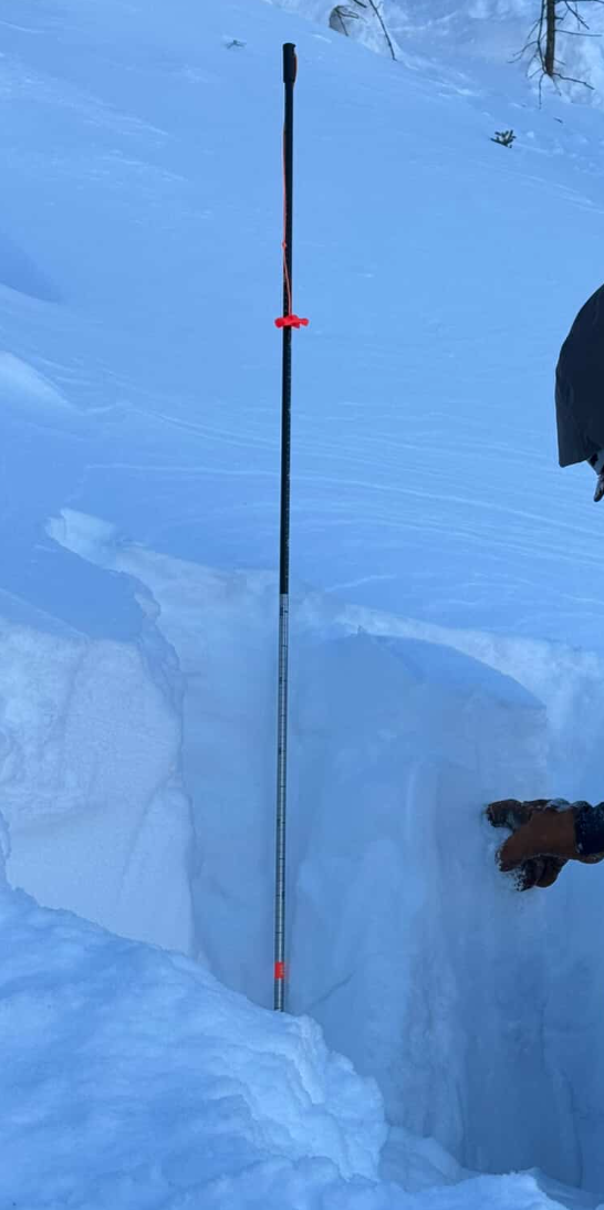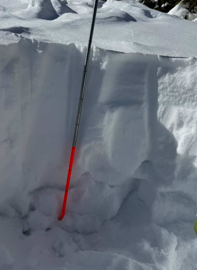 The left and middle slides were very wind-affected, the right slide not so much. The first photo is a pit at the top of the right slide, the second is at the bottom of the left slide. There was a thick ice crust 50cm down at the bottom and 90 cm down at the top. In both cases, the snow on top was relatively uniform in hardness, and the layer on top of the crust seemed well-bonded based on ect and hand shear tests.